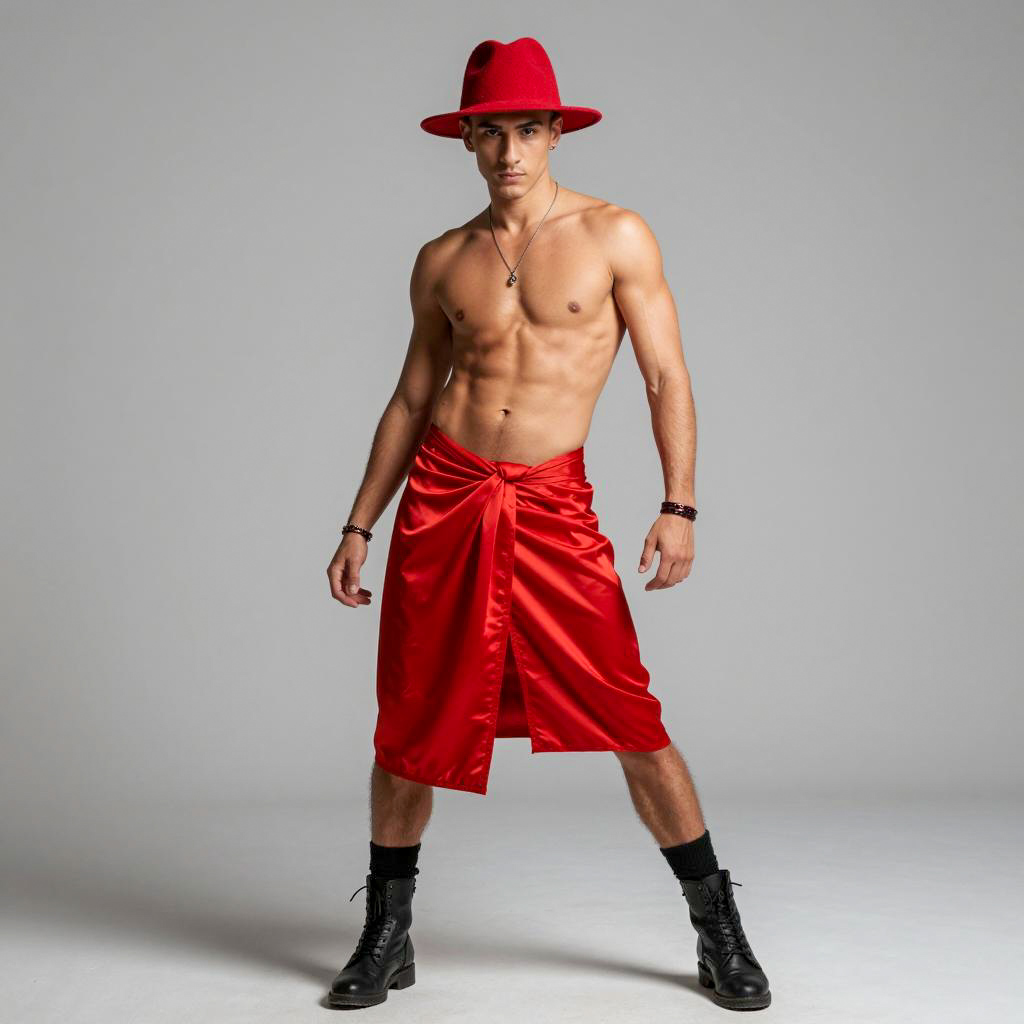 Costume dance hip hop, photograph of a muscular, shirtless man, wearing a red hat, red sarong-style skirt, black socks, and black boots, standing in front of a gray background, studio lighting, slightly tilted pose, visible abs, necklace, wristbands, vibrant red colors, modern fashion style