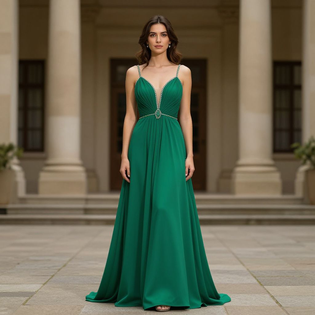 Photograph of a young woman with fair skin and dark brown, wavy hair standing in front of a classical building with tall columns. She is wearing a floor-length, emerald green gown with a deep V-neckline and thin straps adorned with silver embellishments. The gown has a cinched waist and a flowing, silky skirt. She stands confidently with a neutral expression, hands by her sides. The background features a stone-paved courtyard and the building's entrance is slightly blurred. The overall scene is elegant and sophisticated.