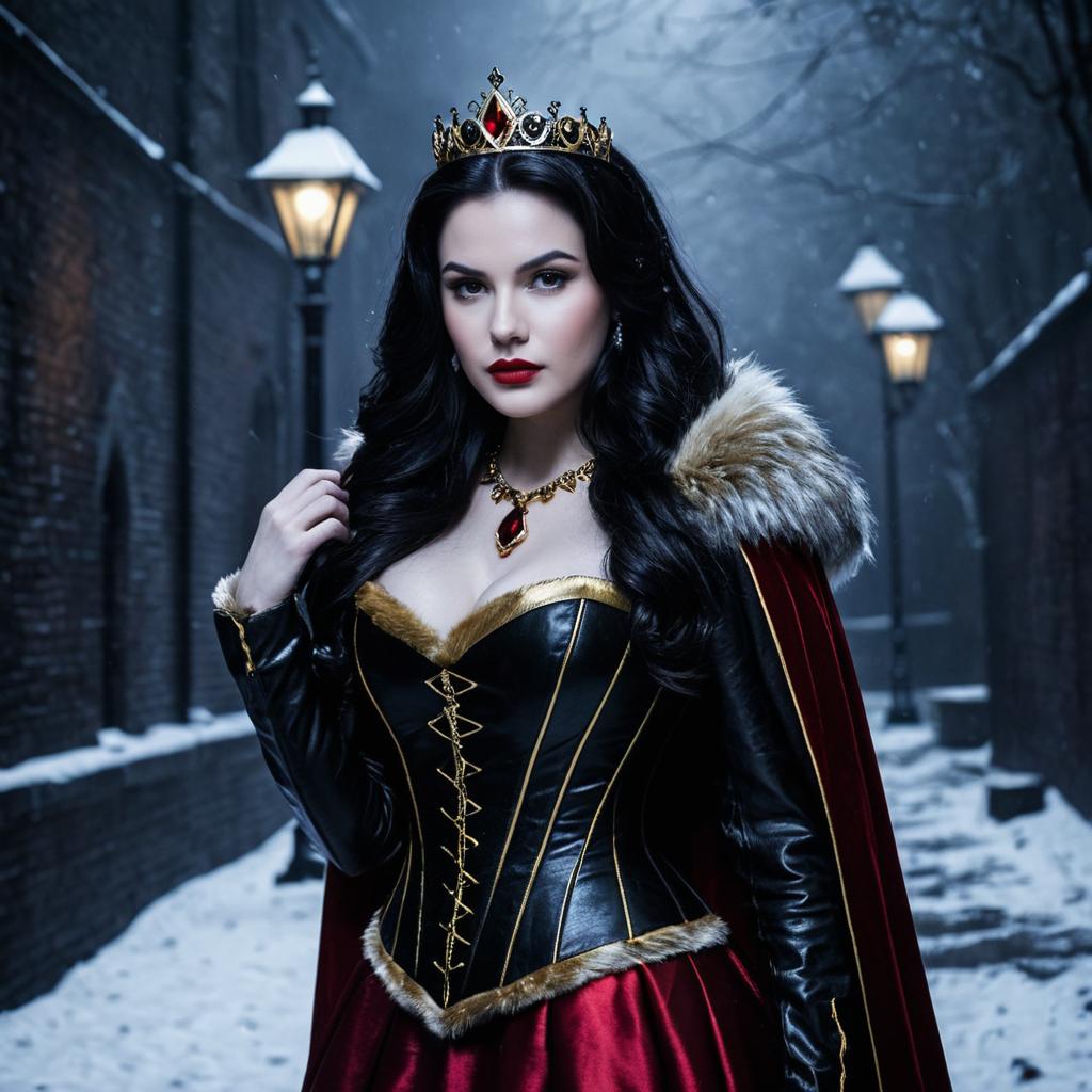 Woman evil queen costume, photo of a woman, Snow White cosplay, fantasy medieval style, standing in a dark, foggy alleyway, wearing a black corset with gold trim, black leather long sleeves, red satin skirt, fur-trimmed cape, purple gemstone necklace, tiara, wavy dark hair, red lipstick, serious expression, dimly lit background with street lamps, realistic CGI style, detailed ures, dramatic lighting, high contrast, focus on character, atmospheric background.