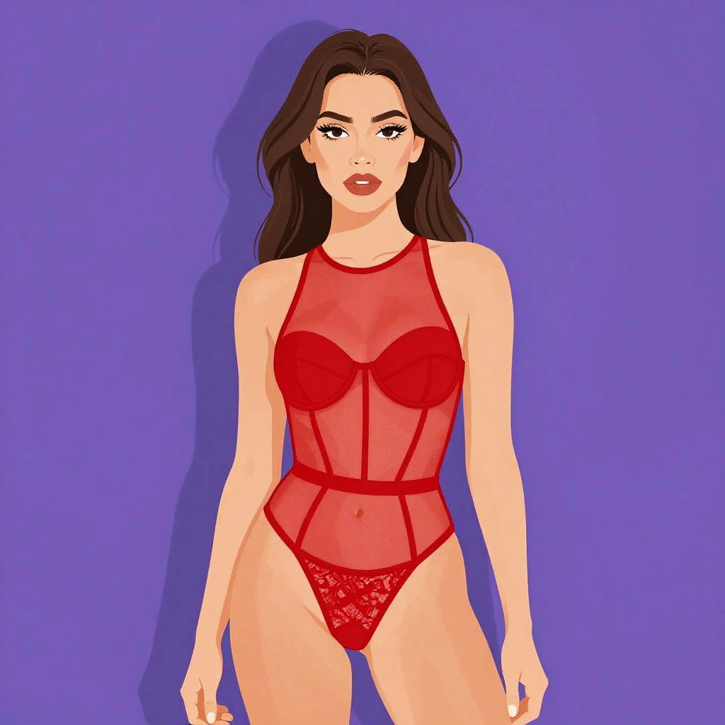 Digital illustration of a young woman with long brown hair wearing a vibrant red mesh bodysuit featuring sheer panels, bold geometric patterns, cut-out sides, and underwire support. She also wears a matching lace thong. The background is solid purple, emphasizing the edgy and modern design of the outfit.