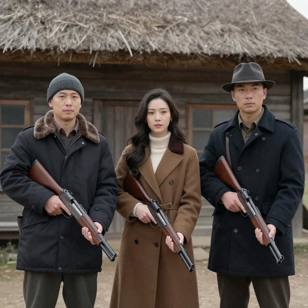 Photograph of three people in winter clothing holding guns. A man in a dark coat and fedora stands right, a woman with long dark hair in a brown coat stands center, and another man in a dark coat with a fur collar stands left. They are in front of a rustic wooden building with a thatched roof.
