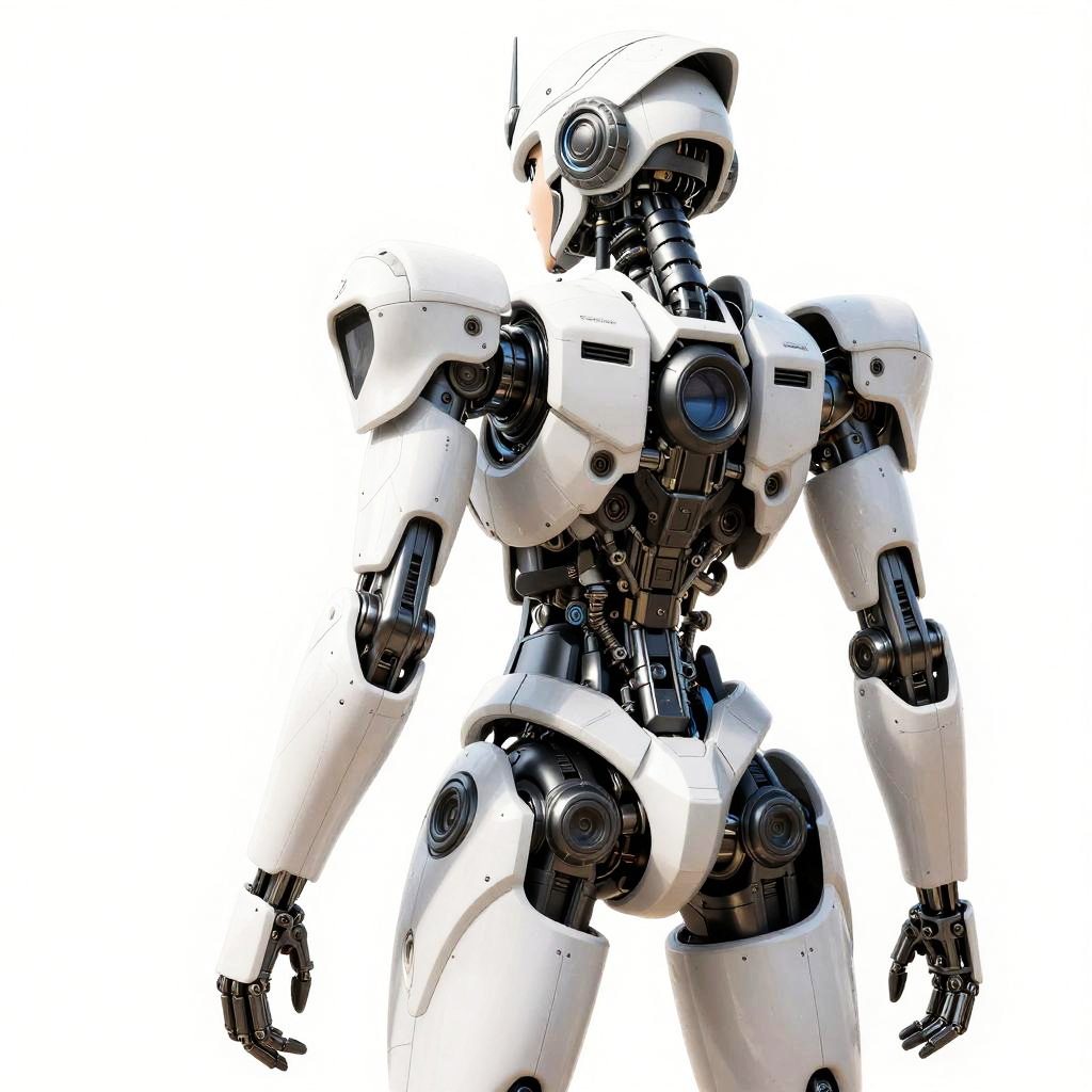 Best quality, intricate details, (hyper-realistic digital illustration), (masterpiece:1.1), robot, robot joints, joints, helmet, armor, robot girl, mechanical parts, headgear]:1> mecha musume, machanical parts, headgear, from back, half-side, black and white parts, (full body)