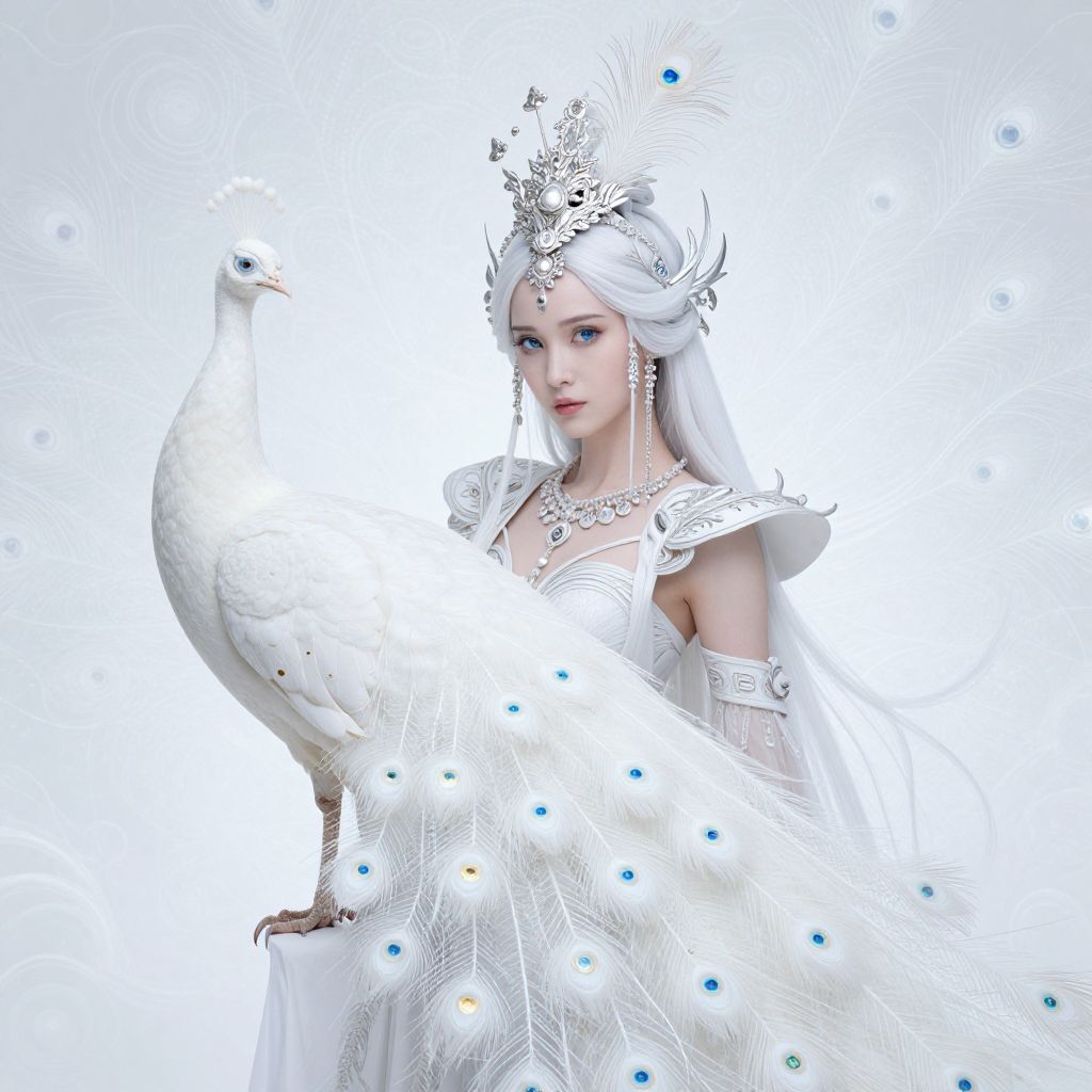 The image depicts a beautifully detailed fantasy scene featuring a woman and a white peacock. The woman, with her delicate, intricate attire and elaborate headpiece adorned with peacock feathers, exudes an ethereal and magical aura. Her skin is pale, and her eyes are a striking shade of blue, adding to the otherworldly atmosphere. The white peacock, with its vibrant, iridescent feathers in shades of blue and gold, is gracefully perched on her arm, creating a harmonious blend of natural and fantastical elements. The background is a soft, magical white, with swirling patterns and delicate textures that enhance the dreamlike quality of the scene. The overall composition is balanced, with the woman and the peacock centrally positioned, drawing the viewer's attention to their intricate details and the interplay of colors and textures. The image is a stunning representation of fantasy art, capturing the essence of a fairy tale world.