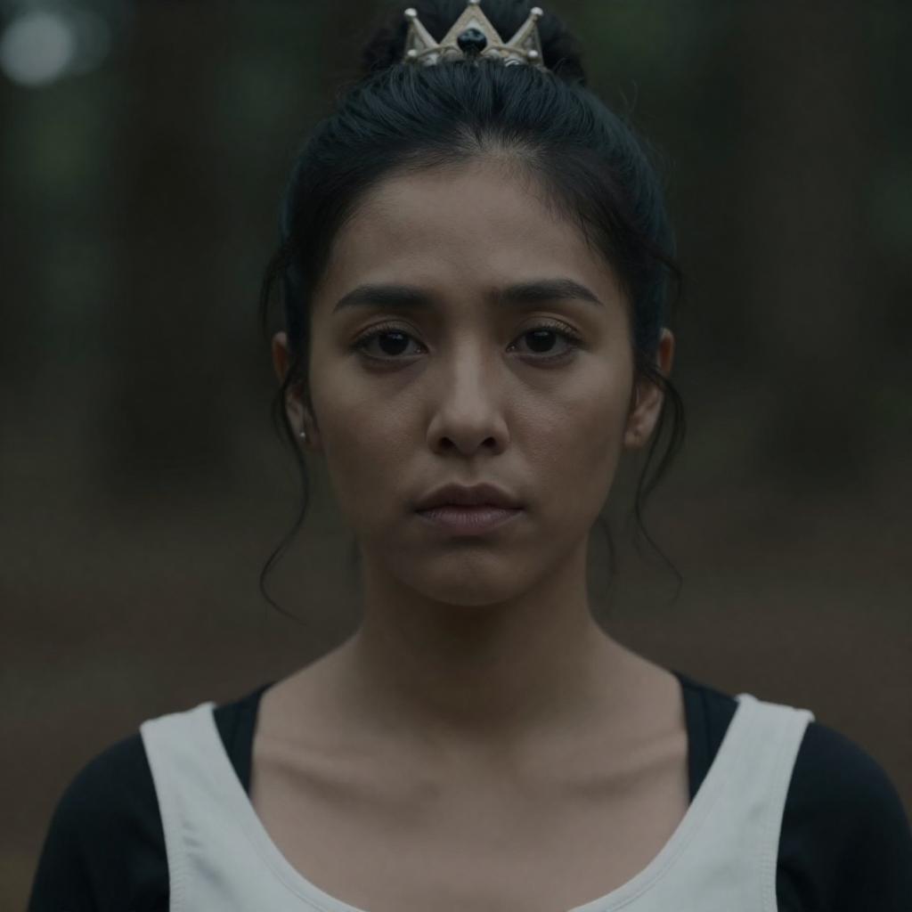 Woman with wet, muddy hair and face, wearing a muddy shirt, standing in a pond. Green reeds in background. Lilies on pond surface. Ripples around her. She looks slightly to the side, expression neutral. Natural light. Photographic image.