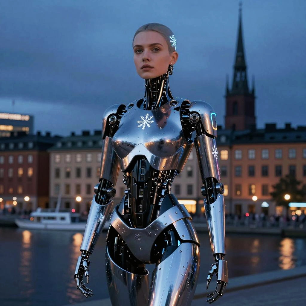 AI Swedish girl robot, sleek metallic body with Nordic design motifs, standing in Stockholm cityscape at night, neon lights reflecting, sci-fi cyberpunk aesthetic