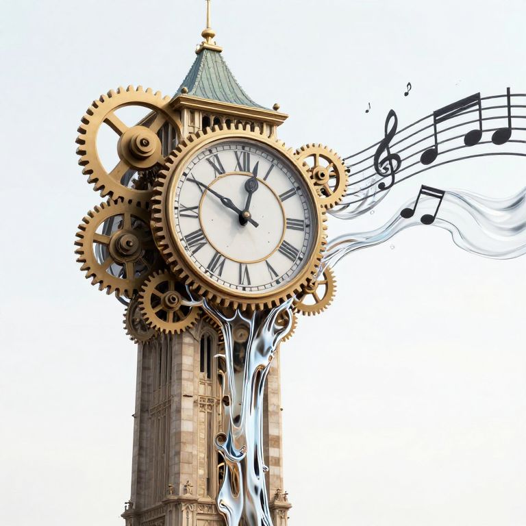 A surreal clock tower dissolves into cascading streams of liquid, its gears etched with musical notes that seem to ripple and flow like water, defying the boundaries between time, music, and matter.
