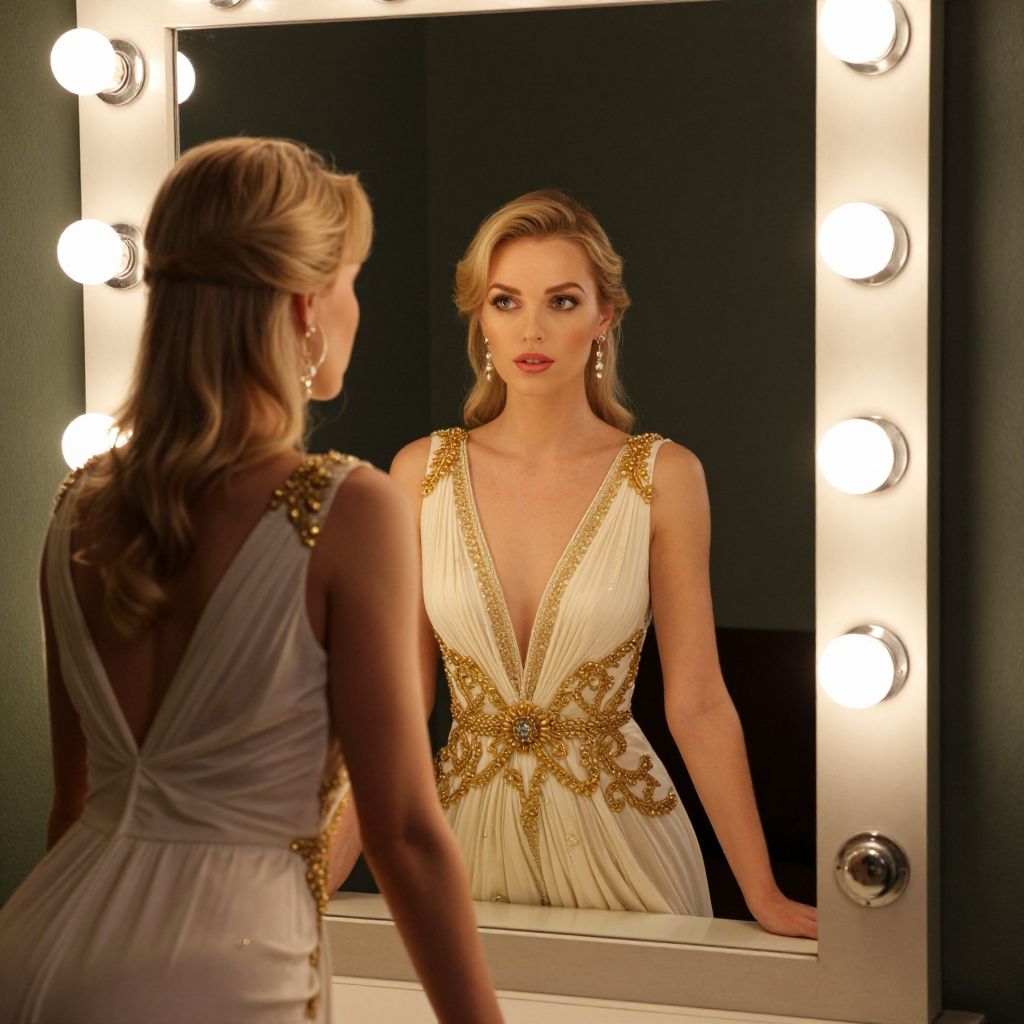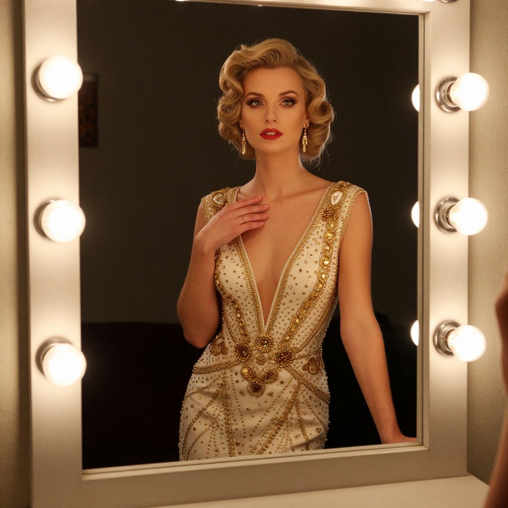 Elegantly styled blonde woman admiring herself in a vintage Hollywood-style dressing room mirror, surrounded by four warm filament bulbs on either side, while wearing a cream gown adorned with intricate gold embellishments.