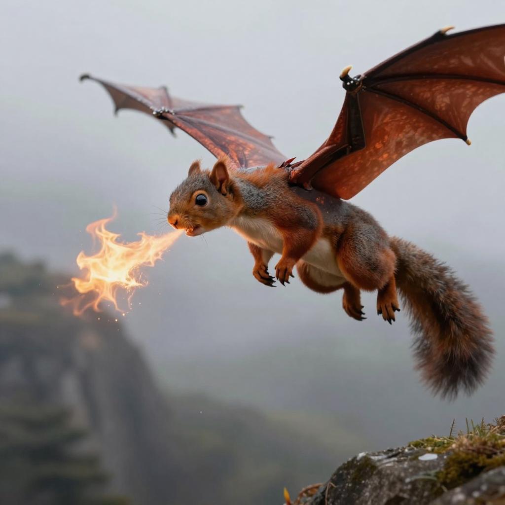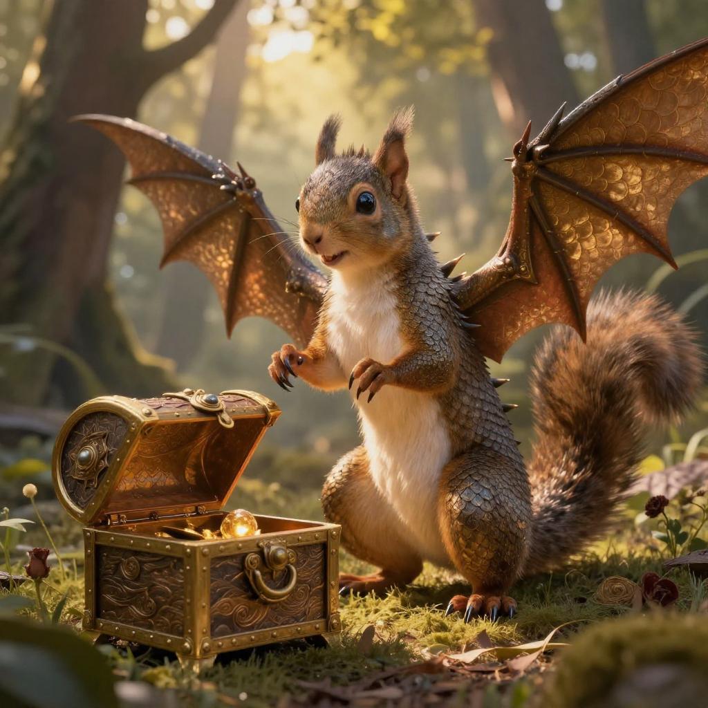 Majestic squirrel dragon guarding a mystical treasure chest in an enchanted glade, intricate scales mixed with squirrel fur texture, golden light filtering through trees, fantasy art