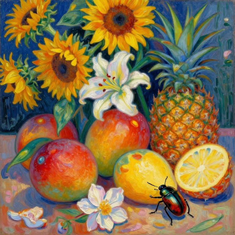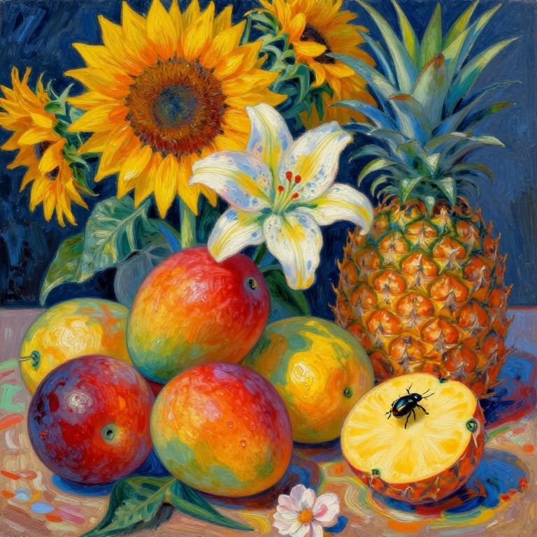 Compose an image in the spirited manner of post-impressionist still life, portraying a 'bug's-eye view' from a diminutive beetle as it navigates across a colorful tapestry of fruits and blossoms. Showcase an array of ripe, luscious fruits such as mangoes and pineapples intertwining with blooming sunflowers and lilies, producing a lush, earthy spectrum of deep reds, oranges, and yellows juxtaposed against the cool blues of the petals. The scene should radiate warmth and energy as the sunlight casts playful shadows over the surface, capturing ephemeral moments in an impressionistic brushstroke style that prioritizes emotion over realism.