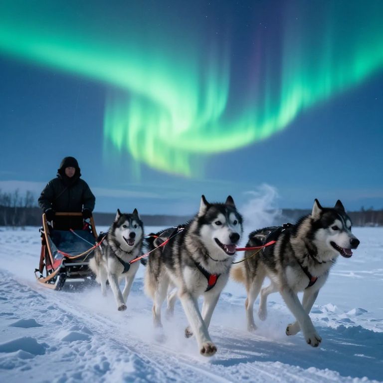 A pack of Siberians sled dogs pulling a wooden sled through an icy tundra, muscles rippling under thick fur, breath visible in cold air, majestic northern lights swirling above, dynamic and powerful scene.