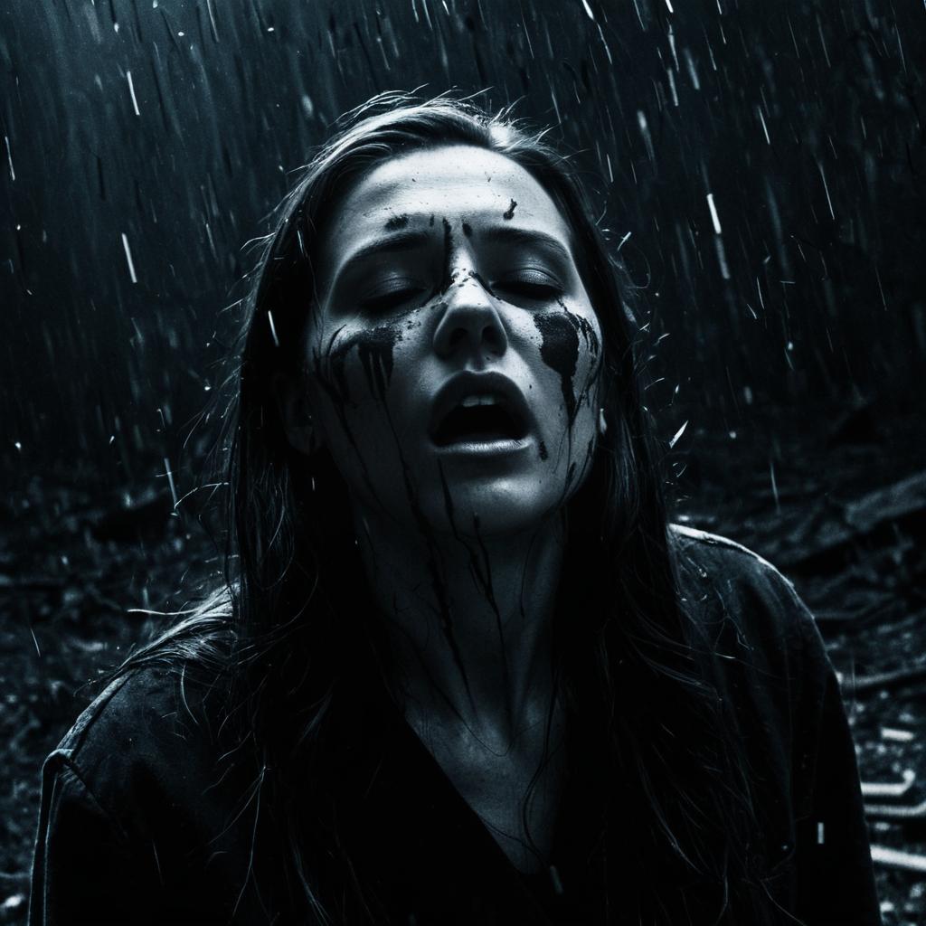 Close-up of a young woman with black paint streaked on her face standing outdoors in the rain. The dark and moody image captures her intense emotional expression with eyes closed and mouth slightly open. She has long wet hair and wears a dark jacket. The background is blurred and shadowy, enhancing the dramatic and somber atmosphere.
