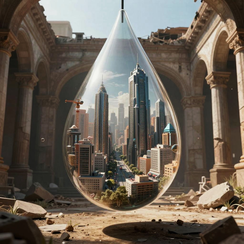 A teardrop-shaped glass filled with a bustling, futuristic cityscape, hovering in an ancient, deserted ruin, creating a juxtaposition between advanced technology and historical decay, complete with hyper-realistic details, cinematic lighting, dynamic, cinematic, masterpiece, intricate, hdr