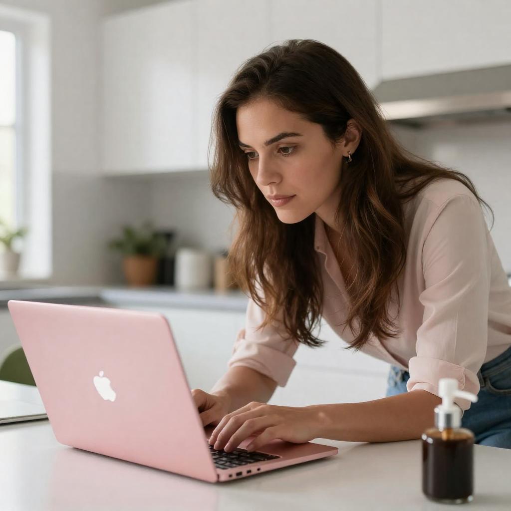 Photograph of a smiling woman with straight, shoulder-length blonde hair, wearing a light pink coat over a white top. She is in a store, sitting at a checkout counter with stacked boxes and shelves filled with products in the background.