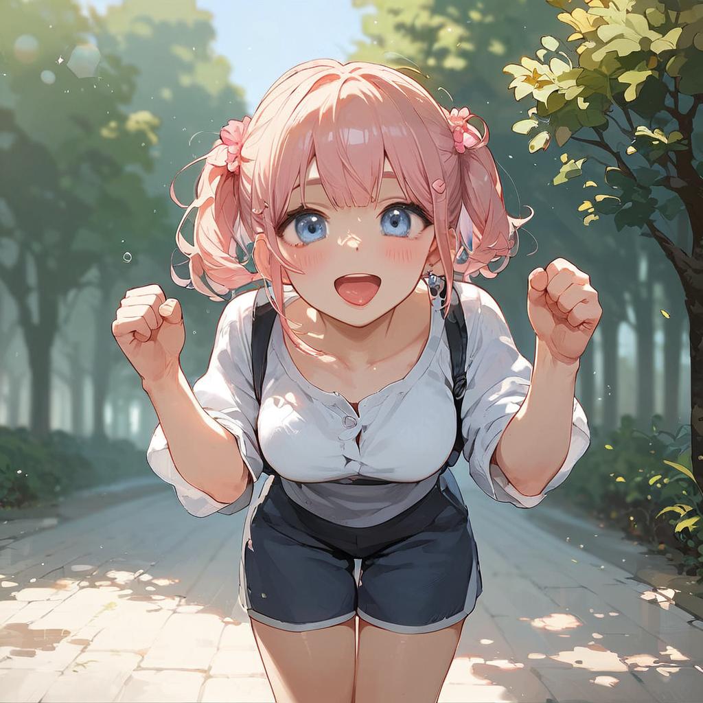 Narusawa, score_9, score_8_up, score_7_up, source_anime, 1girl, adorable_girl, looking at viewer, :d, smile, blush, open mouth, casual, cowboy_shot, clenched hands, hands in front of your chest, leaning_forward, knees_together_feet_apart, lens_flare, blurry, park