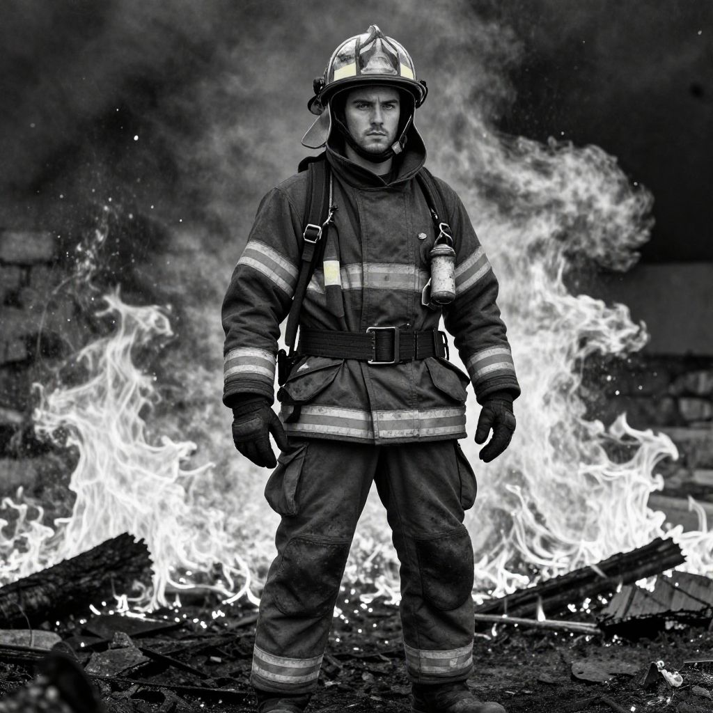 Intense, dramatic portrait: a brave firefighter, rendered in striking black & white, stands firm against raging inferno, his resolute expression radiating courage, amidst swirling smoke, fiery embers, and charred debris; intricate details accentuate worn leather boots, soot-stained helmet, and the rugged texture of his protective gear. Man has masculine face and piercing eyes