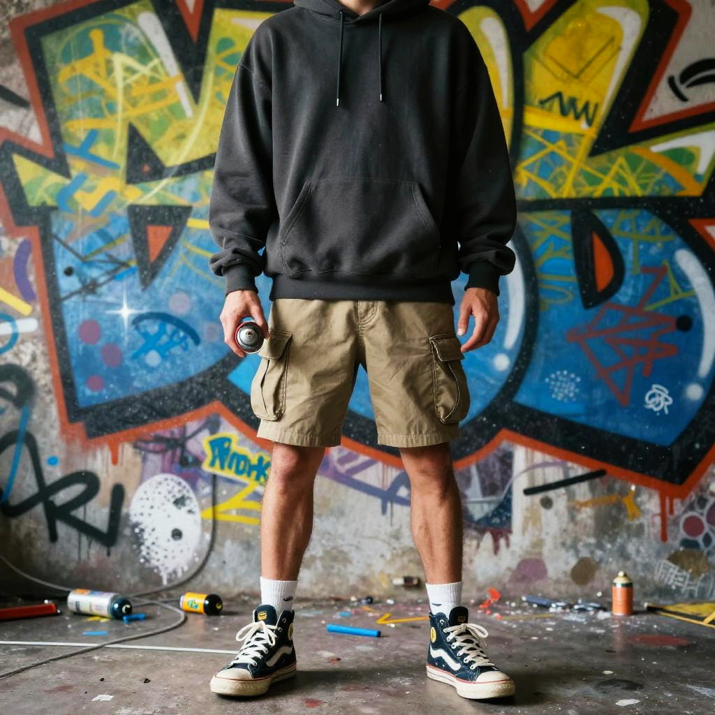 Realistic photo.A bold depiction of a neon-dripping graffiti artist wearing a layered mesh top and cargo shorts, with colorful paint splatters on body, set against a rain-drenched urban street at night. realistic photo