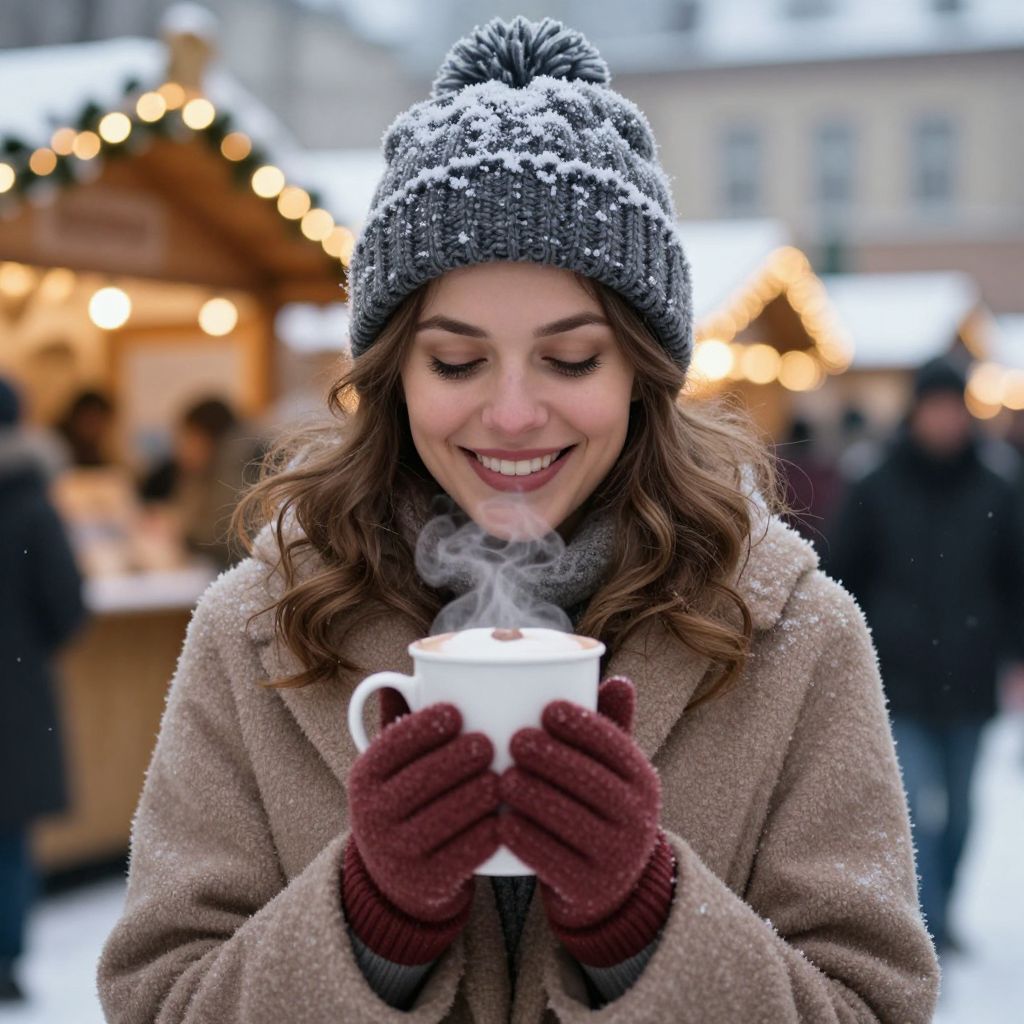 In the heart of a snowy holiday market, a woman wrapped in warmth and anticipation cradles a steaming cup of hot chocolate, her smile radiating joy amidst the soft hum of festive lights and the crisp bite of winter air.