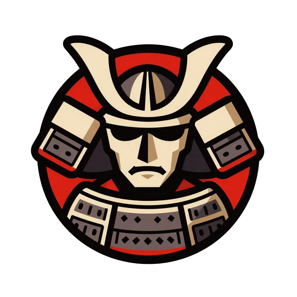 Japanese style logo inspired by samurai armor patterns, geometric shapes, muted earth tones with accents of crimson, dynamic and striking visual conveying strength and tradition.
