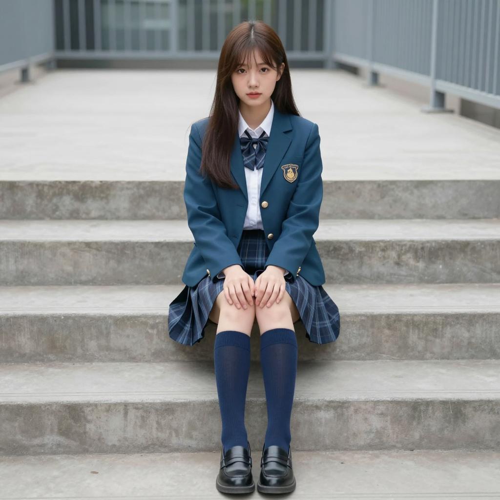 Young Japanese woman with long dark brown hair, sitting on wooden bench. Wearing black blazer, white shirt, blue and white striped tie, and plaid skirt. Hands resting on lap. Bright outdoor setting with green inflatable structure in background. Smiling gently. Medium shot.