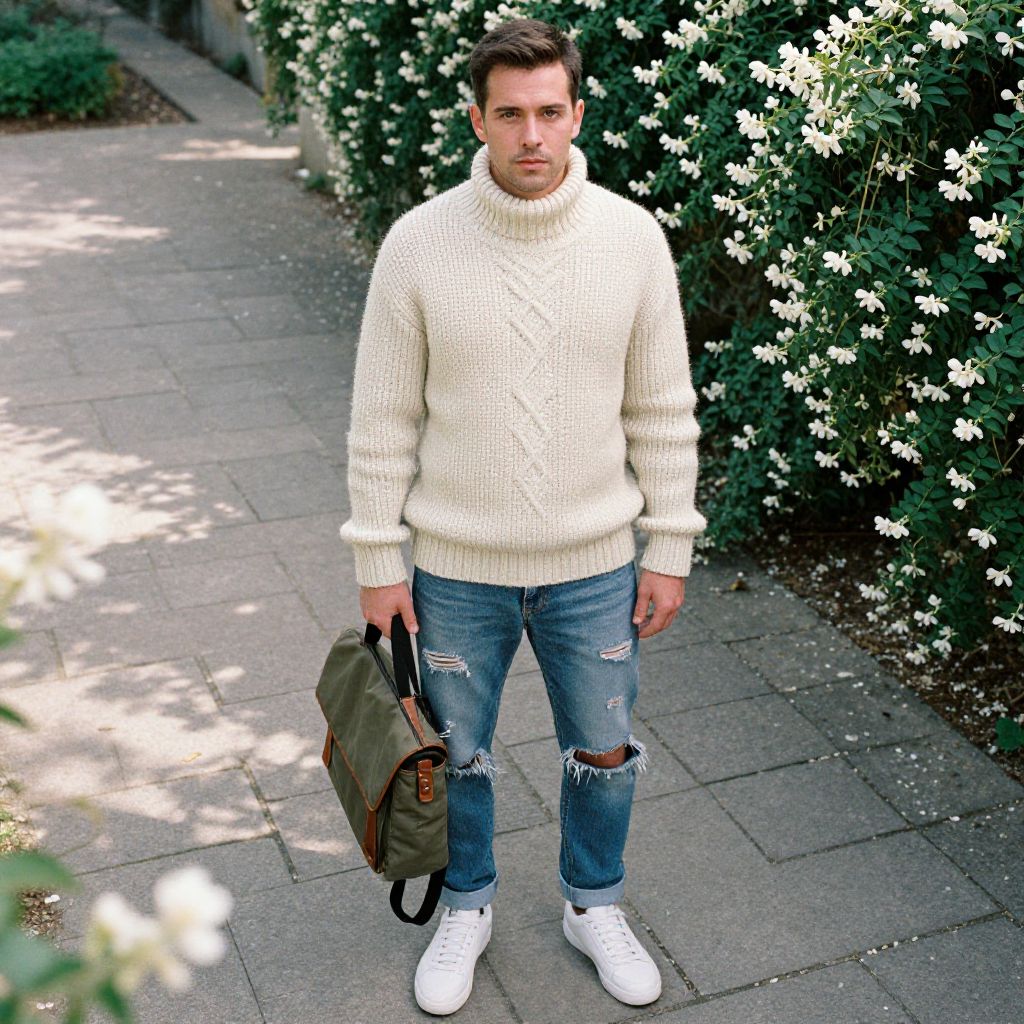 Photograph of a young white man with short brown hair and a medium build, standing on a sunlit, stone-paved path. He wears a chunky, cream-colored knit sweater with a high neck, ripped blue jeans with distressed knees, and white sneakers. He holds a brown and olive green messenger bag in his right hand. Behind him is a lush bush adorned with white flowers, casting dappled shadows on the path. The overall scene is bright and summery, with a casual, stylish vibe.