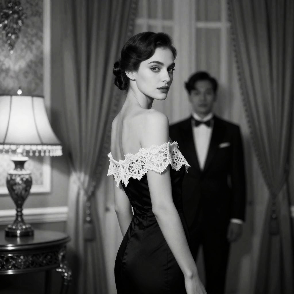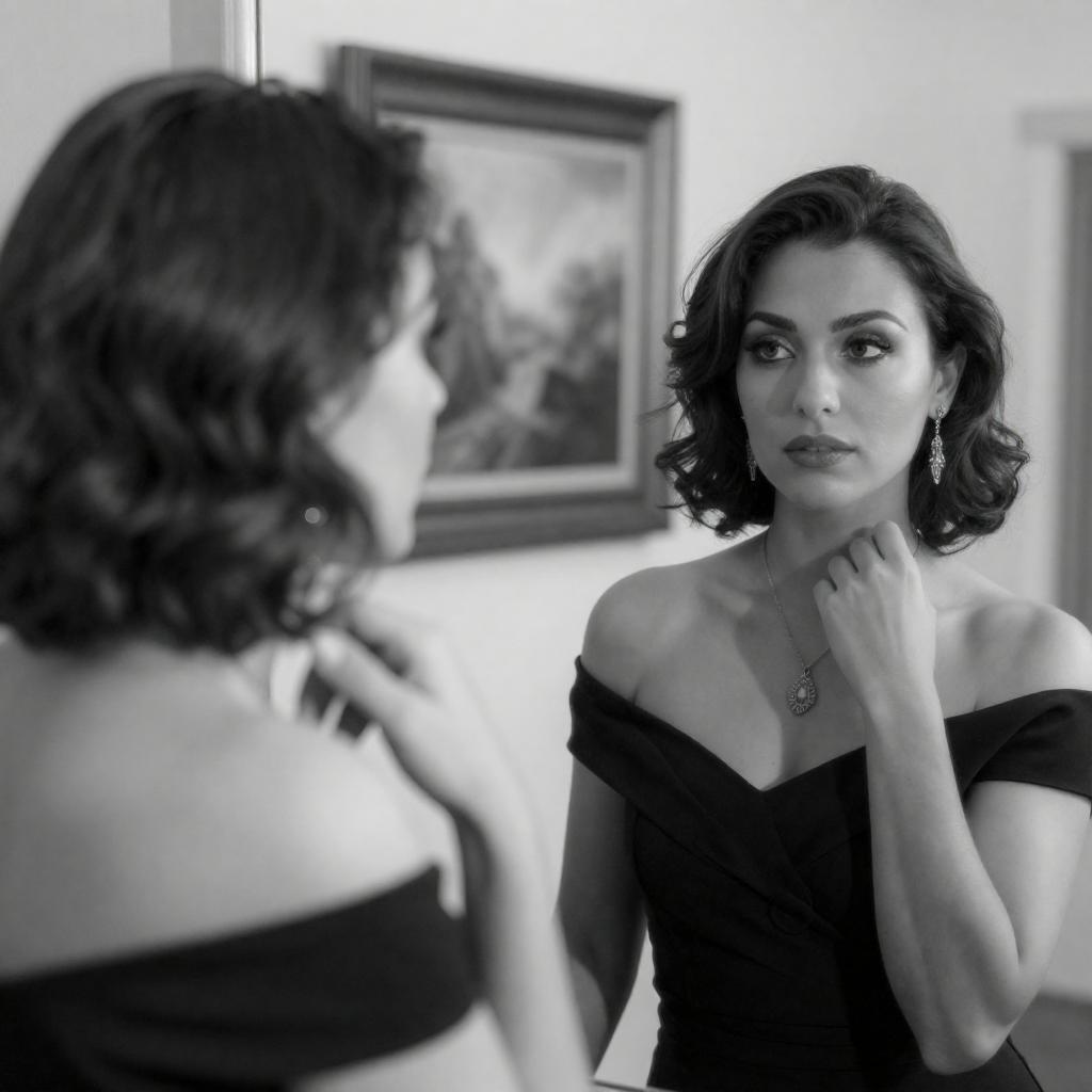 Black and white photo of a young woman with dark hair in an updo, wearing a strapless black evening gown and pearl necklace, standing in front of a vanity mirror framed by round lights. The woman gazes intensely into the mirror while leaning on the table. The background shows framed photos on a wall, and the vanity table holds glassware and makeup brushes.
