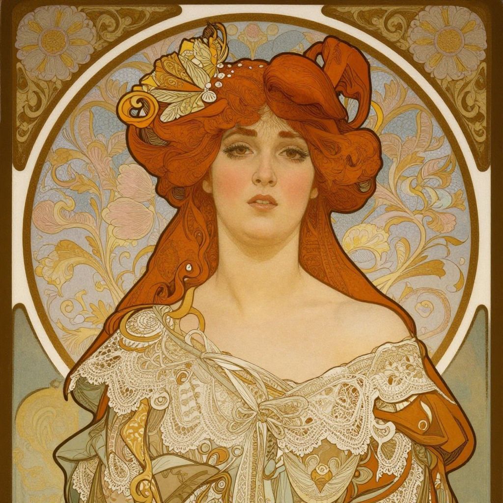 A beautifully detailed Art Nouveau-style illustration reminiscent of Alphonse Mucha's work, featuring a woman with vibrant red hair adorned in elegant lace attire, set against an ornate, floral-patterned background with golden accents and soft, vintage-inspired lighting.