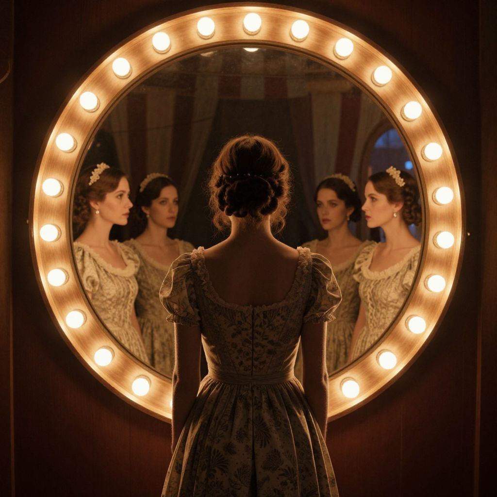 A surreal, cinematic composition featuring a woman in a vintage dress standing before a glowing, circular mirror adorned with warm, theatrical lights, reflecting multiple versions of herself in a dreamlike, alternate reality reminiscent of a circus's whimsical and introspective ambiance.