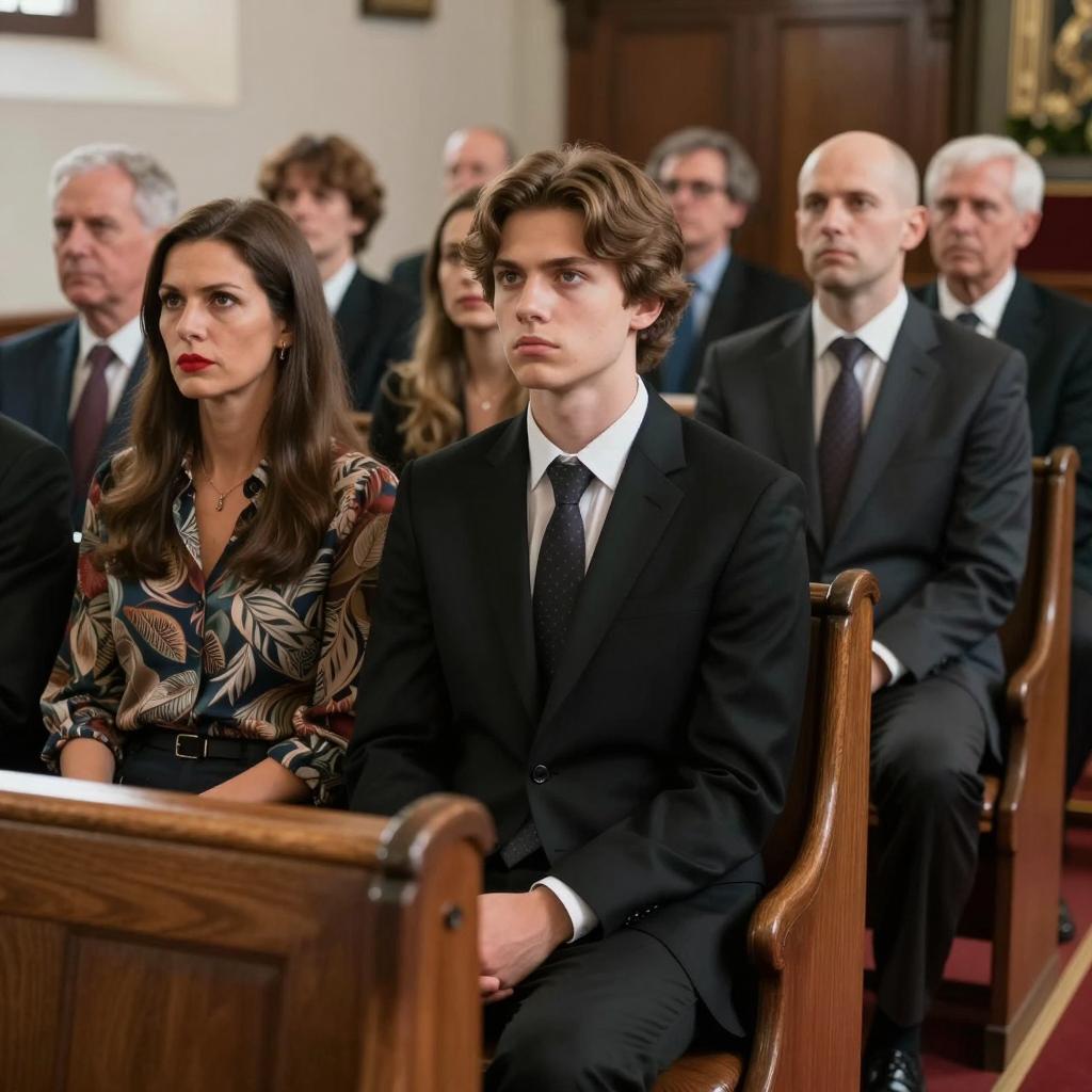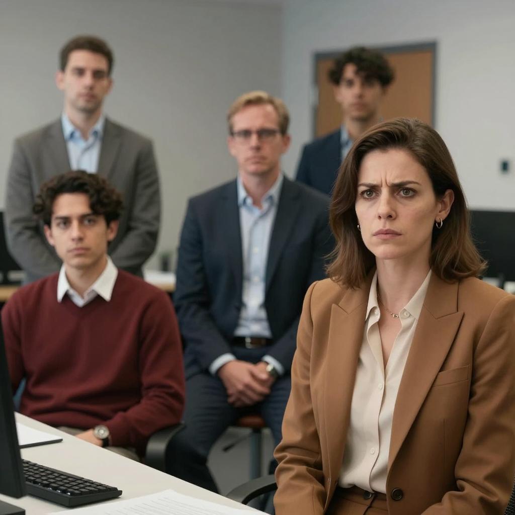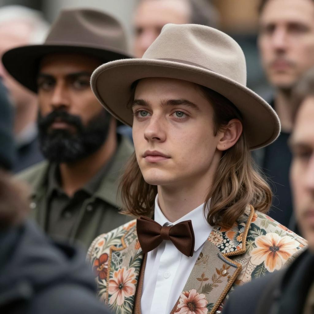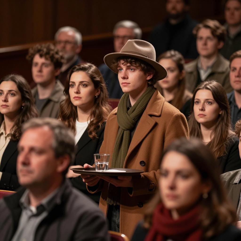 Photograph of a crowded indoor theater. Two central figures: a young man with light skin, brown coat, beige hat, green scarf, holding a tray with a glass, and a young woman with light skin, brown hair, black top, looking forward. Surrounding people, varied appearances, focused expressions. Warm lighting, dark background.