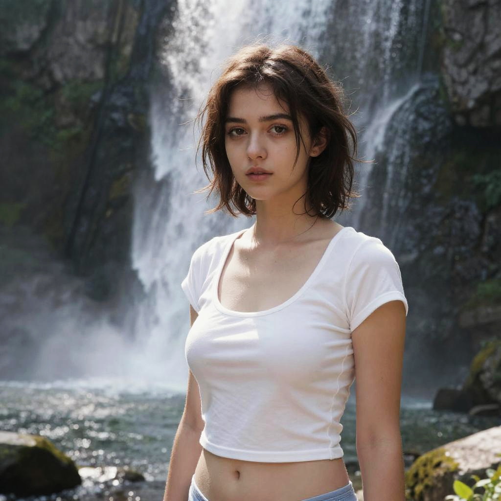 Closeup photo of a 12 year old woman, (caucasian white skin:1.2), wearing a cutoff (unbuttoned plunge military jacket:1.2), black hair in a pony tail, sultry expression, in a jungle, Cannon EOS 5D MARK III, 50mm Sigma f/1.4 ZEISS lens, F1.4, 1/800s, ISO 100, photorealistic, beautiful face, instagram, 1girl, navel, flat-chested breasts