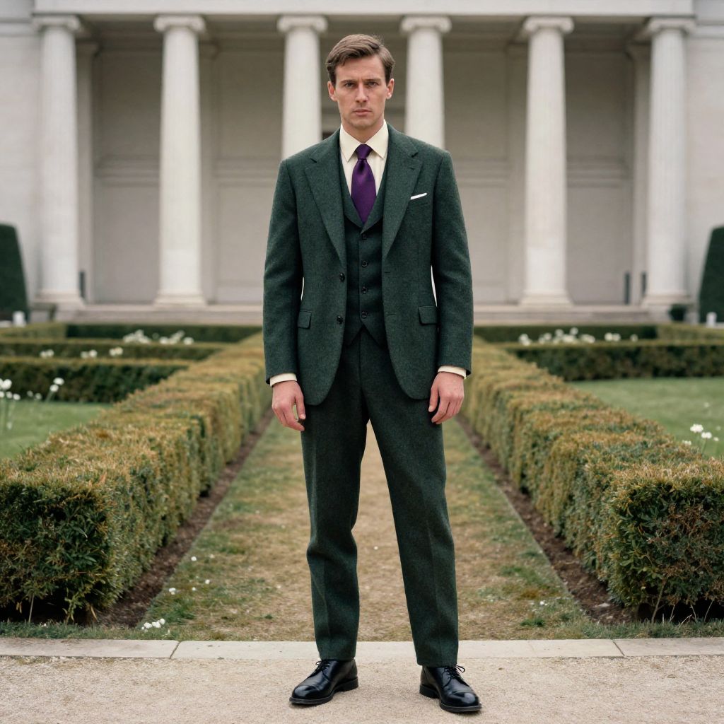 A man, dark green wool three-piece suit, ivory dress shirt, deep purple silk tie, black leather derby shoes, neoclassical façade, towering columns, manicured gardens, lithographic film style, confident expression Man has masculine face and piercing eyes