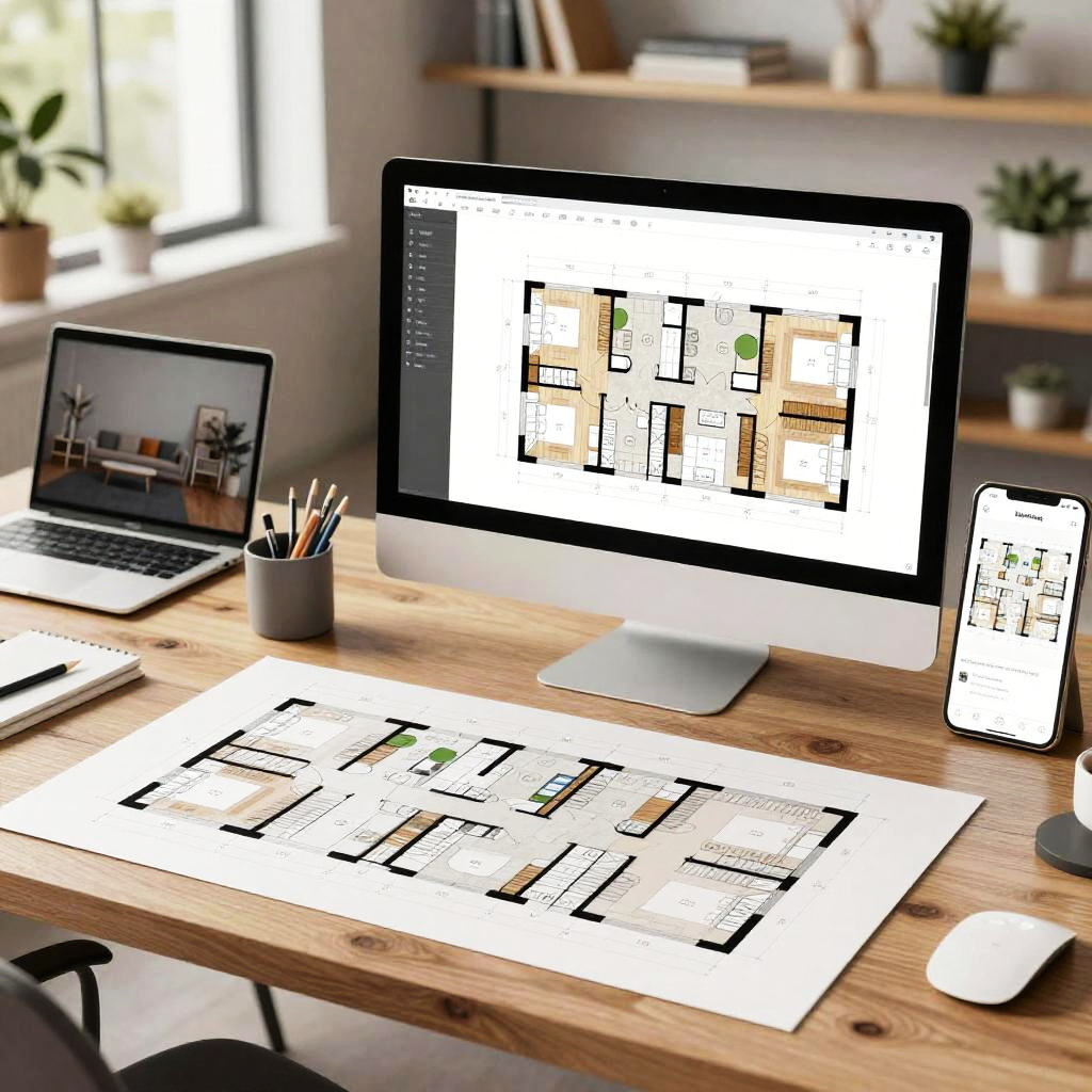 AI floorplan generator free showcasing state-of-the-art architectural planning, multiple device screens displaying layered floorplans, professional architect's workspace, natural lighting, contemporary furniture, sharp digital graphics, creative tech vibe