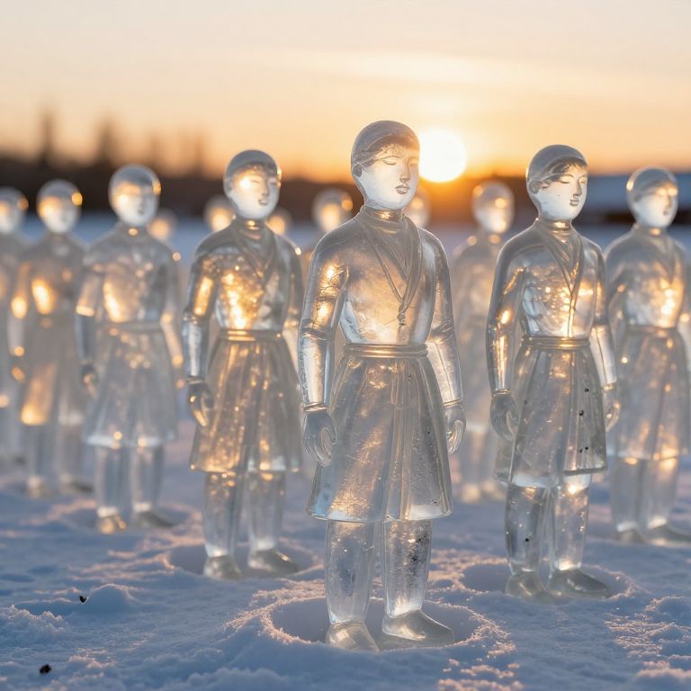 A procession of translucent glass figures stands solemnly in the snow, their ethereal forms illuminated by the golden glow of a setting sun, creating a surreal tableau where light and shadow dance across their crystalline surfaces.