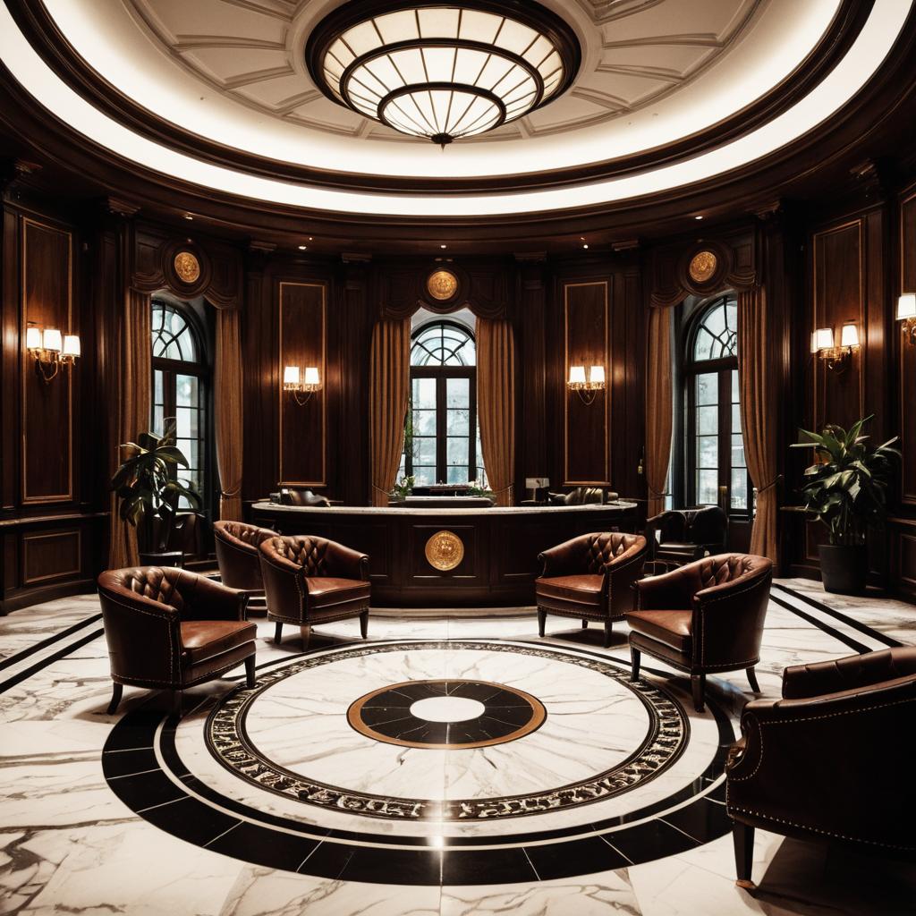 Albert Bierstadt A luxurious hotel reception, with ornate gilded mirrors, featuring black marble flooring and gold-trimmed furnishings. Warm cinematic lighting enhances the highly detailed, inviting atmosphere, 4K ultra-realistic visuals.