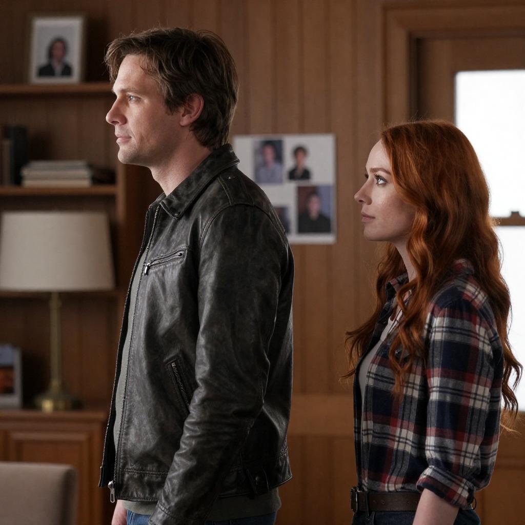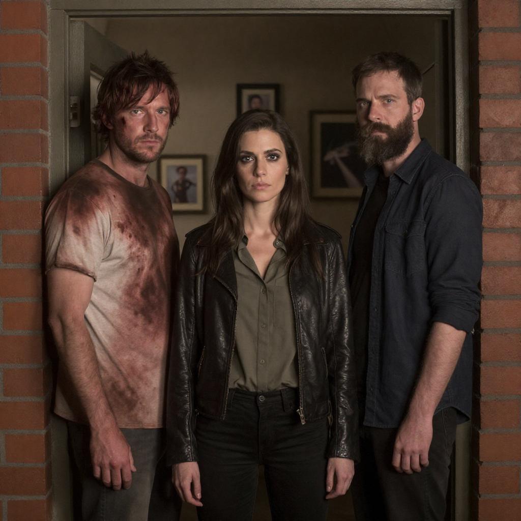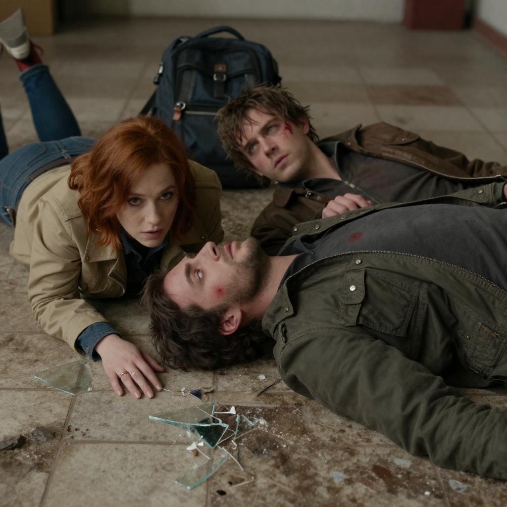 Two people, a red-haired woman and a brown-haired man, lie on a dirty, broken tile floor. The woman has short hair, a tan jacket, and a ring. The man has messy hair, a blood smear on his face, and a green jacket. Both look intense. The man's backpack is behind him. The setting is an indoor area with broken glass and debris.