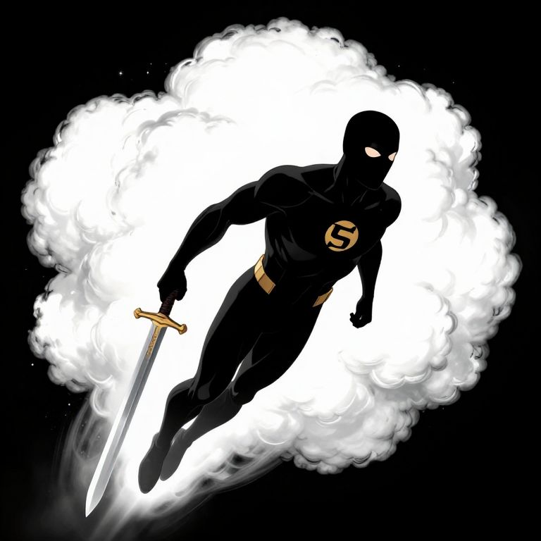 Digital illustration of a black masked, muscular figure with an "S" emblem, floating amid a white, glowing cloud, holding a sword.