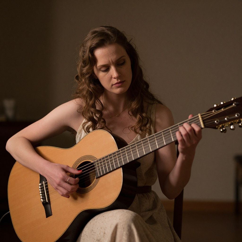 In a hushed embrace of serenity, a woman adorned in elegance listens intently as a musician's guitar strings weave a melody of timeless connection, their shared gaze hinting at the delicate dance between memory and longing.