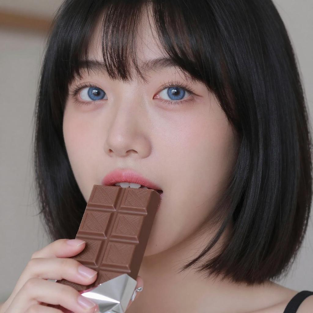 Close-up photo of a young woman with fair skin and straight, black bob haircut, holding a chocolate bar near her lips. Her blue eyes are slightly upturned, and she's wearing pink lipstick. The chocolate bar has a grid pattern. The lighting is soft and even, highlighting her face. The camera angle is slightly above eye level, and the background is blurred, putting her face in sharp focus.
