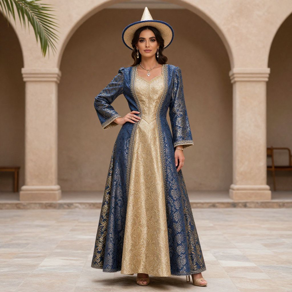 Photograph of a confident woman with medium brown skin and dark, wavy hair, wearing a long, elegant blue and gold embroidered dress with a deep V-neck. She has a wide-brimmed hat with a white center. Her right hand rests on her hip, and she stands in a stone-courtyard with beige arches in the background. The dress has long sleeves with white trim, and she wears simple brown sandals. The lighting is natural, highlighting the textures and colors of the outfit. She has a serious expression and is centered in the frame.