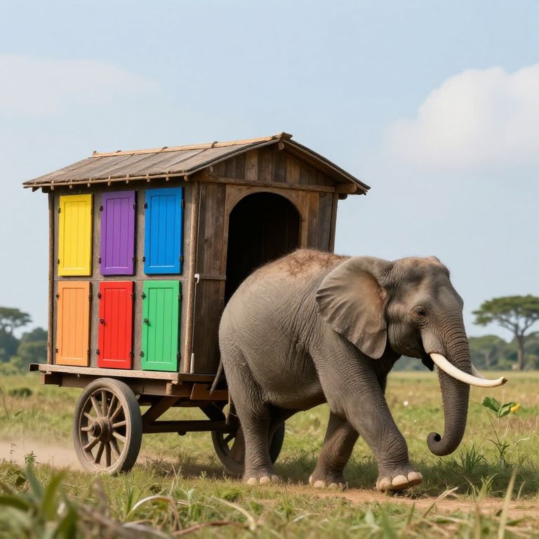 Photograph of a large African elephant walking on a grassy plain, pulling a colorful wooden cart with a thatched roof. The cart has four brightly painted doors in red, yellow, green, and blue. The elephant's gray, wrinkled skin contrasts with the vivid colors of the cart. Its large, white tusks are prominently visible. The background features a clear blue sky and distant trees. The cart is on four wooden wheels, and the elephant appears to be moving forward. The scene is set in a savanna environment.