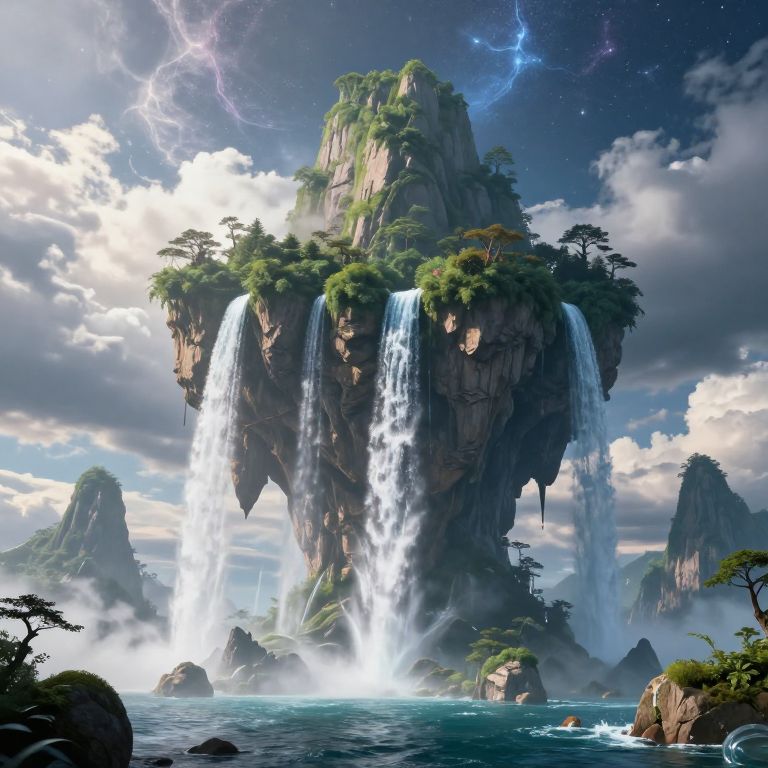 A stunning 3D-rendered fantasy landscape features towering, inverted mountains emerging from the ocean floor, adorned with lush greenery and cascading waterfalls that defy gravity, ascending toward a mesmerizing sky filled with ethereal starlight and dramatic clouds, creating a surreal and otherworldly atmosphere.