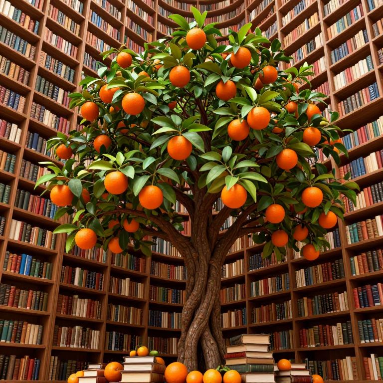 In a whimsical digital art rendering, a vibrant tree laden with orange fruits sprouts amidst towering bookshelves, its branches weaving through the library's wooden architecture, creating a surreal fusion of nature and knowledge where tomes bear fruit that promises vivid bursts of shared memories.