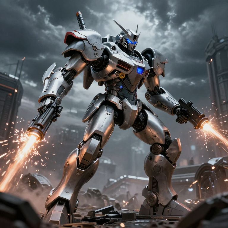 High-tech iwanna inspired mech warrior standing in a futuristic battleground, metallic armor shining under a stormy sky, sparks flying from energy weapons, dynamic pose, detailed mechanical design, dystopian atmosphere, digital art style with sharp contrasts and intense colors.