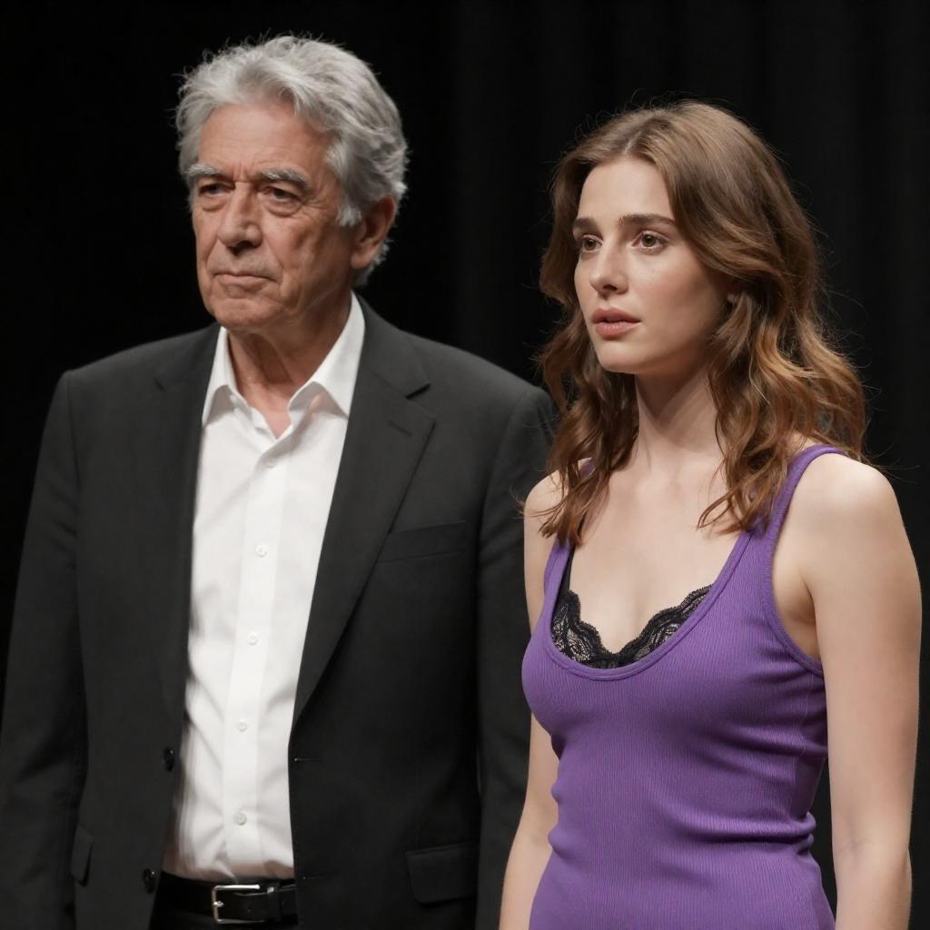 Photograph of an older man with gray hair in a black suit and white shirt standing beside a younger woman with light brown hair in a purple ribbed tank top with a low neckline, revealing a black lace bra. They stand against a dark curtain background, both looking slightly to the left.