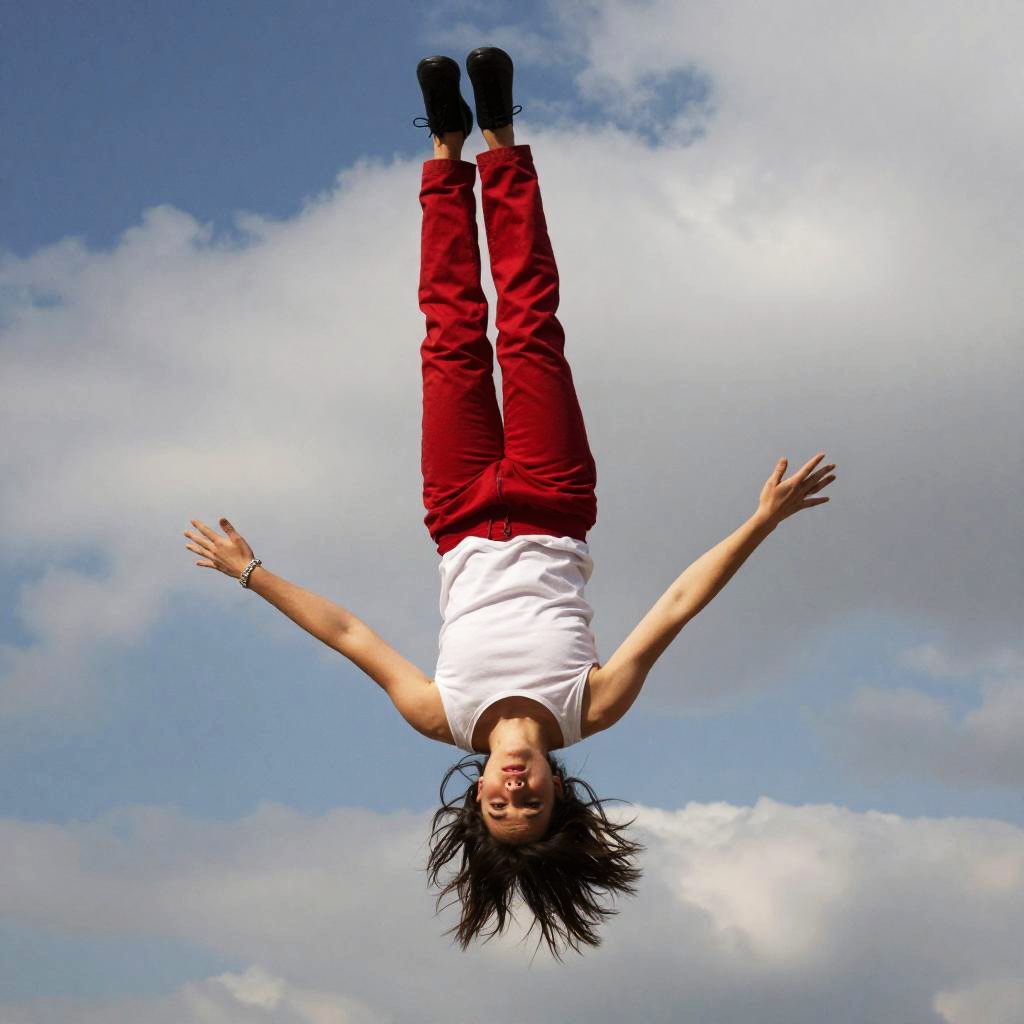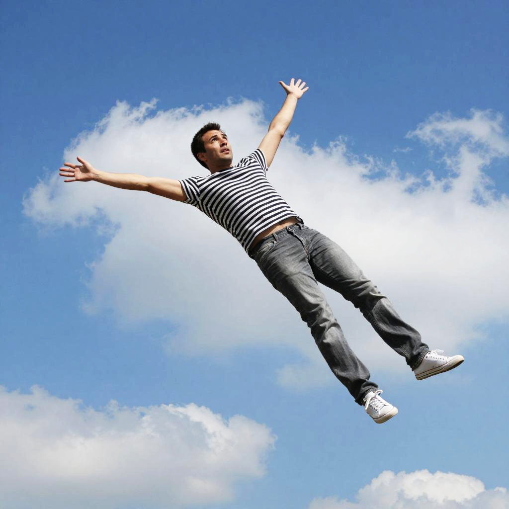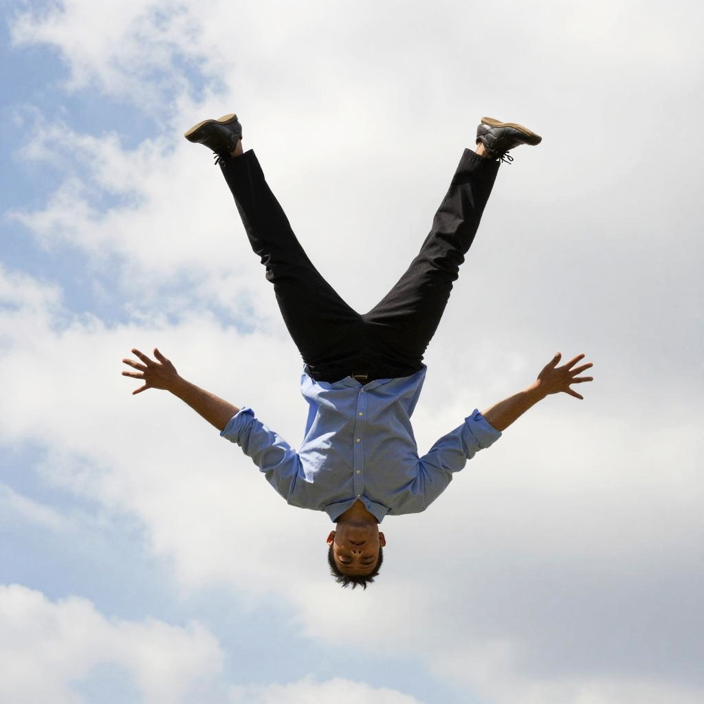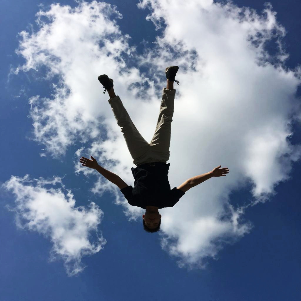 A digital image showing a silhouetted figure falling upside down against a bright blue sky with scattered white clouds. The person's limbs are spread out, and the overall scene has a surreal, almost comic-book style. The figure is black and sharply contrasted with the vibrant sky. The image has a slightly blurry, painterly texture.