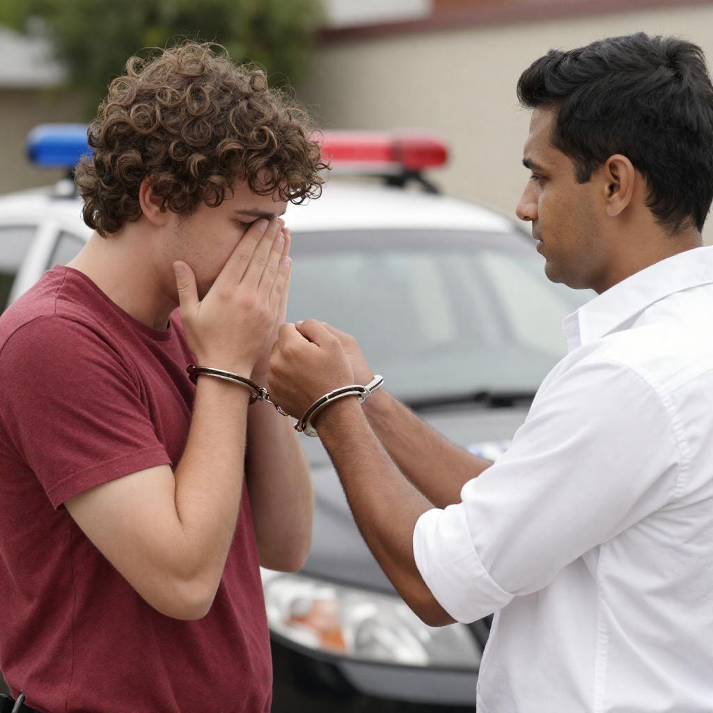 A male police officer with short dark hair leans over the window of a black car at night, holding a flashlight to illuminate the face of a seated African American male driver with short hair. The scene takes place in a dimly lit urban environment with blurred red and green lights in the background.