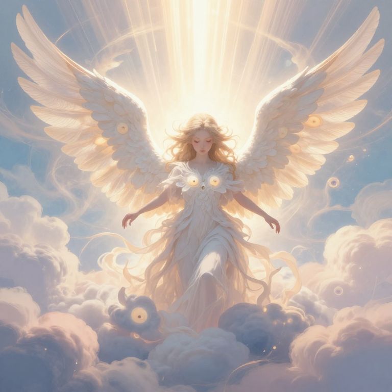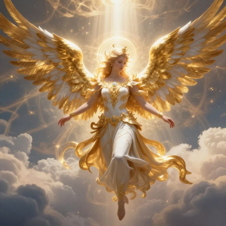 Divine figure emerging from radiant clouds, arms outstretched, bathed in warm sunlight, with intricate angelic wings and heavenly architecture in the background