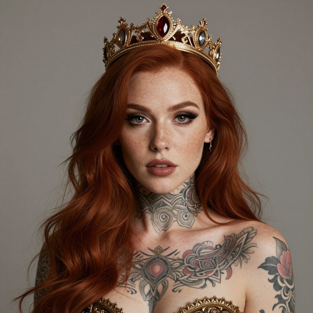 A beautiful, red-haired woman with freckles and a crown, wearing intricate tattoos, reigns supreme in a detailed, super-realistic photograph.