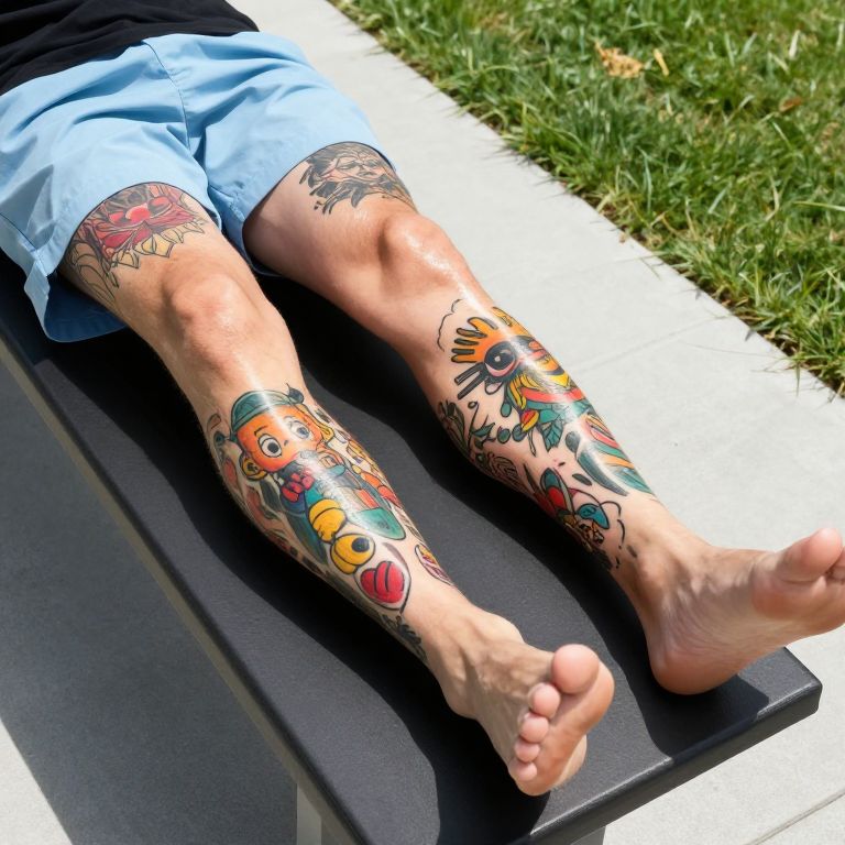 A photo of a person's tattooed legs stretched out on a black bench. The legs feature colorful, detailed tattoos including cartoonish characters and vibrant designs. The person is wearing light blue shorts, and the background shows a grassy area with a white concrete edge. The sunlight casts a bright reflection on the legs, highlighting the intricate tattoo work.