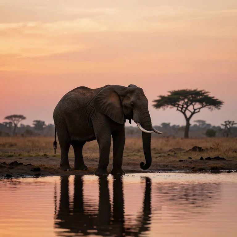 A majestic elephant stands by the edge of a water body in the savannah during sunset. The warm orange-pink hues of the sky are beautifully reflected in the calm water. A solitary acacia tree is visible in the background, contributing to the serene and peaceful landscape.