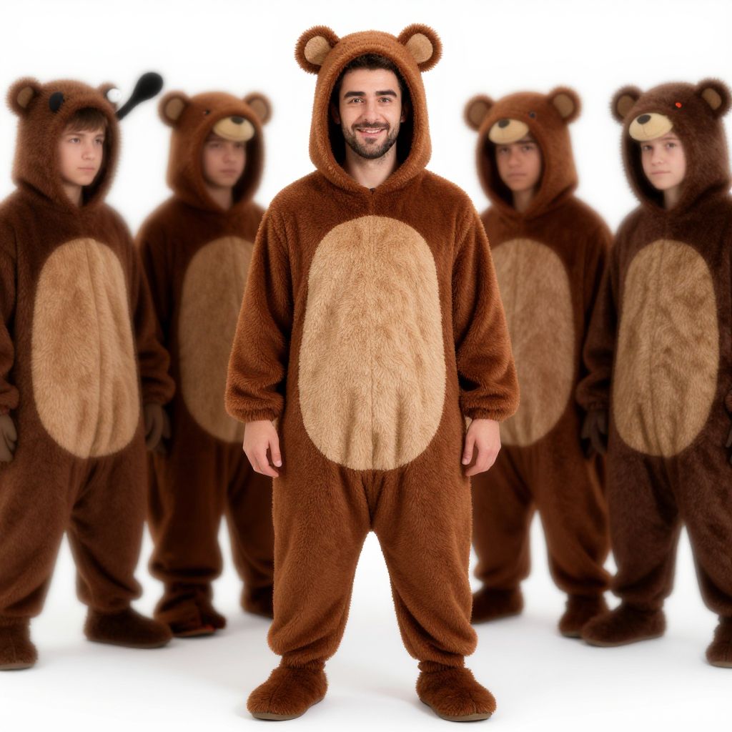 Sumo suit costume, male focus, full body, short hair, solo focus, animal costume, multiple boys, bara, bear costume, mature male, hood up, facial hair, smile, kigurumi, standing, 1boy, thick eyebrows
